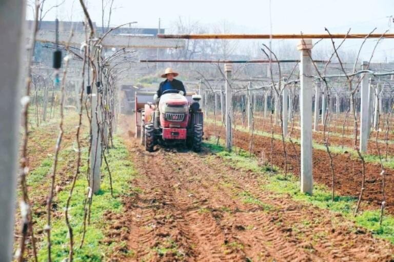 這邊藍莓大棚管護正忙,不遠處的獼猴桃種植園里,種植戶杜東宏駕駛著果園專用開溝施肥機,在果園里來回穿梭,一次性完成開溝、施肥、覆土全流程作業(yè),肥效直達根系,為獼猴桃萌芽積蓄充足養(yǎng)分。