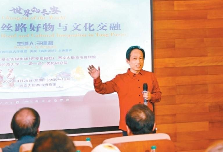 講座中,于賡哲精準(zhǔn)錨定“長(zhǎng)安、唐詩(shī)、絲路”三大核心,圍繞“世界的長(zhǎng)安——唐詩(shī)中的絲路好物與文化交融”主題,以唐詩(shī)為切入點(diǎn),將歷史典故與絲路好物相結(jié)合,深入淺出地解讀了唐詩(shī)中反映的絲路商貿(mào)往來(lái)與文明交融細(xì)節(jié)。從石榴、葡萄、苜蓿等西域食材通過(guò)絲路傳入長(zhǎng)安,豐富人們餐桌,到琵琶、胡旋舞等西域藝術(shù)融入盛唐文化,成為唐詩(shī)創(chuàng)作的靈感源泉。于教授用生動(dòng)的事例、風(fēng)趣的語(yǔ)言,帶領(lǐng)觀眾在唐詩(shī)的韻律中重走絲綢之路,感受盛唐長(zhǎng)安的開放與繁華,讓大家深刻體會(huì)到“長(zhǎng)安”作為絲路起點(diǎn)的厚重底蘊(yùn)、“唐詩(shī)”作為城市記憶載體的鮮活魅力,以及“絲路”作為文明紐帶的重要價(jià)值。